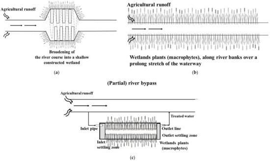 Schematic representation of possible designs for ICWs. (a) Shallow ICW within the watercourse; (b) Wetland plants along the river banks; (c) ICW next to the watercourse functioning as a partial bypass.