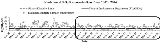 To draw attention to these facts, the EU Water Framework Directive (EU WFD) (2000/60/EC), the Nitrates Directive, and policy makers demand the protection of water resources, promote its sustainable use, and prevent further contamination [6]. Belgium, especially the Flanders region, is greatly impacted by intensive agricultural activities and the main attention is given to animal husbandry. According to the Manure Decree which was implemented as part of the Nitrates Directive, Belgium is obligated to decrease the annual average nitrate concentrations below the 11.3 mgNO3-N/L limit. By 2018, only 5% of all monitoring stations should register nitrate concentrations above the 11.3 mgNO3-N/L; nevertheless, currently 16% of the sampling points are currently exceeding this limit [7]. Furthermore, according to the Flemish Environmental Regulations (VLAREM) 90% of the measurements recorded in polder watercourses on a monthly basis must be smaller or equal to 5.65 mgNO3-N/L up to a maximum of 8.48 mgNO3-N/L [8].