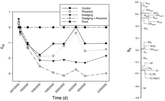 Principal response curves for all water quality variables (except lanthanum), where differences between treatments (enclosures) and the reference (the pond) are given as the regression coefficients (Cdt) of the PRC model. The variable’s weight (bk) in the right vertical diagram indicates the position of the variable on the first PRC axis, in which a negative value indicates a treatment-related increase and a positive value a treatment-related decrease.