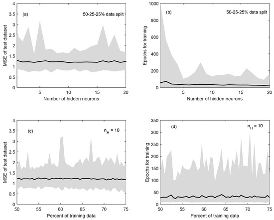 Based on these results, nH = 10 with a 50%:25%:25% data-division was selected as the optimum architecture for this research. The fact that the mean and the variability of MSE was the lowest at nH = 10 makes it a preferred option over the nH = 19 case, which as a lower number of mean epochs but had higher variability in MSE. In other words, higher model performance was selected over model training speed (mean epochs at nH = 10 ranged between 9 and 122 for the 50%:25%:25% data-division scenario). Secondly no significant trend was seen as the amount of data used for training, validation and testing was altered, however lower MSE values were seen at nH = 10 compared to other at nH values. Thus, the option that guarantees the largest amount of independent data for validation and training is preferred. Given the fact that the mean MSE for the testing dataset does not show a significant change as the per cent of training data is increased from 50% to 75%, the initial 50%:25%:25% division is maintained as the final selection.