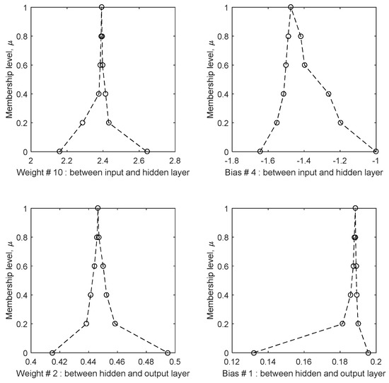 29]. This means that enough α-cut levels need to be selected to completely define the shape of the membership functions. In this research six levels were selected to equally span, and to give a full spectrum of possibilities, between 0 and 1. Overall, the results of the weights and biases in the figure demonstrate that indeed enough levels were selected to define the shape of the membership function. If a smaller number of levels were selected, e.g., two levels, one at μ = 0 and one at μ = 1, the fuzzy number collapses to a triangular fuzzy number. This type of fuzzy number does not provide a full description of the uncertainty and how it changes in relation to the membership level. Thus, intermediate intervals are necessary and the results demonstrate that the functions are in fact not triangular shaped functions and not necessarily symmetric about the modal value (at μ = 1). A consequence of this is that the decrease in size of the intervals does not follow a linear relationship with the membership level. Similarly, a higher number of intervals than the six selected for this research could be used, e.g., 100 intervals, equally spaced between 0 and 1. The risk in selecting many intervals is that as the membership level increases (closer to 1) the intervals become narrower as a consequence of convexity. This will result in numerous closely spaced intervals, with essentially equal upper and lower bounds, making the extra information redundant. This is demonstrated in the sample membership functions for WIH = 10 in