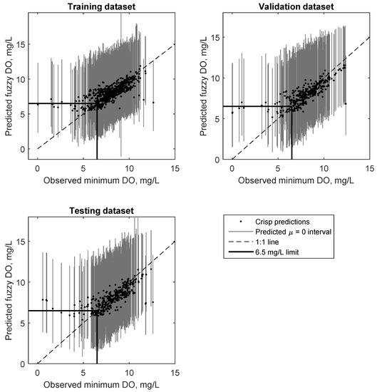 Figure 4 shows the results of observed versus crisp predictions (black dots) and fuzzy predictions (black line) of minimum DO at the membership level μ = 0 for the three different data subsets. The figure illustrates that nearly all (i.e., ~99.5%) of the observations fall within the α-cut interval defined at μ = 0 since the black dots are enveloped by the grey high-low lines of the fuzzy interval. The figure also demonstrates the advantage of the FNN over a simple ANN: while some of the crisp predictions veer away from the 1:1 line (especially at low DO, defined to be less than 6.5 mg/L here), nearly-all (i.e., ~99.5%) of the fuzzy predictions intersect the 1:1 line. This also illustrates that the NSE values reported in