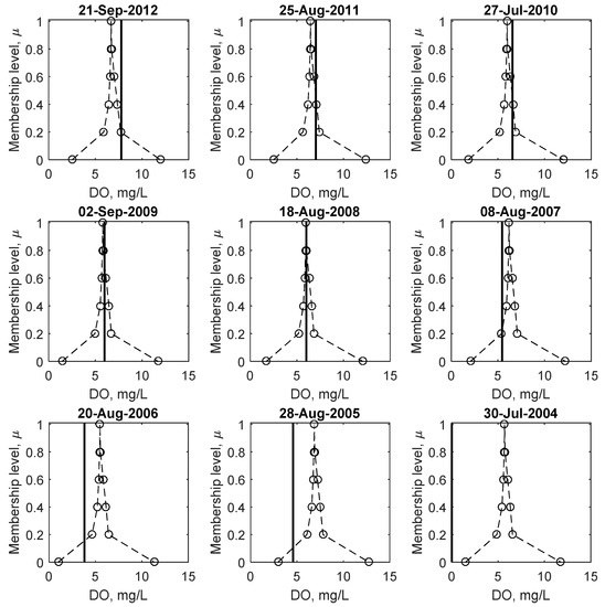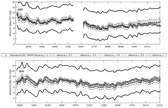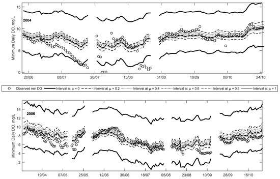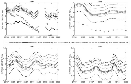 The width of each band corresponds to the amount of uncertainty associated with each membership level, for example, the bands are the widest at μ = 0, meaning the results have the most vagueness associated with it. Narrower band are seen as the membership level increases until μ = 1, which gives crisp results. This reflects the decrease in vagueness, increase in credibility, or less uncertainty of the predicted value. In each of the years shown, note that the observations fall closer to the higher credibility bands, except for some of the low DO events. This means that the low DO events are mostly captured with less certainty or credibility (typically between the 0L and 0.2L levels) compared to the higher DO events. However, it should be noted that compared to a crisp ANN, the proposed method provides some possibility of low DO, whereas the former only predicts a crisp result without a possibility of low DO. Thus, the ability to capture the full array of minimum DO within different intervals is an advantaged of the proposed method over existing methods.