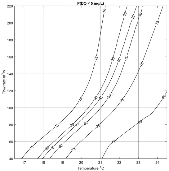 3/s intervals, and water temperature was between 0 and 25 °C at 0.2 °C intervals. For each combination of Q and T, the fuzzy DO was calculated using the FNN. The inverse transformation was used to calculate the probability of predicted DO to be below 5 mg/L for each combination of inputs.