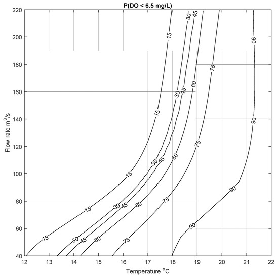19] with respect to overall rate of false positives; though the present method predicts a smaller number of false positives. Similar results were seen for the 6.5 mg/L (93%) and 9 mg/L (95%) cases. This shows that while the model may predict a possibility of low DO events, the vast majority of them have a very low probability of occurrence, owing to their skewed predicted membership functions. The calibrated FNN model was used to create a low DO risk tool where the risk (i.e., probability) of low DO was calculated from the fuzzy DO using the inverse transformation described in Equations (1) and (2). First, values of Q and T were selected to represent average conditions in the Bow River. The flow rate selected was between 40 and 220 m