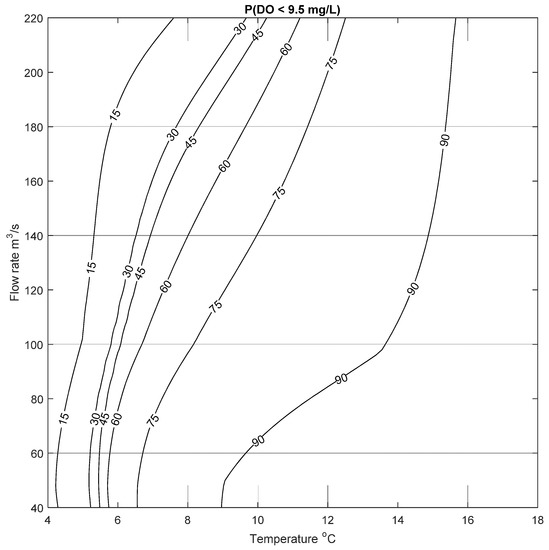 Figure 11. Similar results can be seen for these two cases, where the risk of low DO increases with increasing temperature and decreasing flow rate, as expected. These figures demonstrate that the probability of low DO is generally high for the type of conditions seen in the Bow River. The mean annual water temperature and flow rate for the study period was between 9.23 and 13.2 °C, and 75 and 146 m