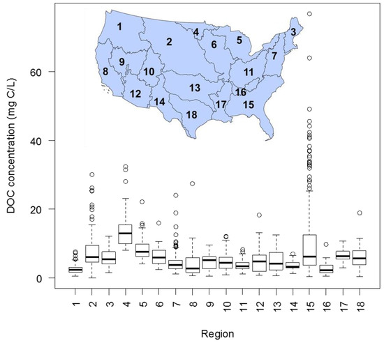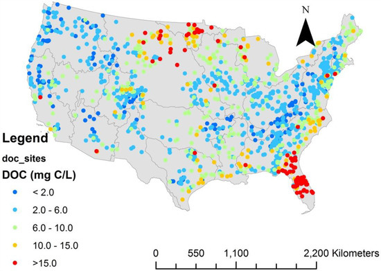 3.1. Spatial Variability of DOC Concentrations in the U.S.