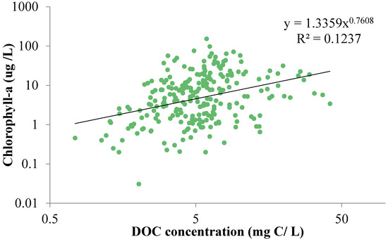Scatter plot and linear regression between DOC concentration and chlorophyll-a.