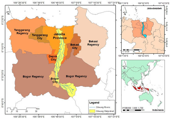 Recently, the situation of water security in the most populous and rapidly developing regions, especially the megacities of Asia, is worsening because of major challenges such as overexploitation of groundwater, skewed water supply and demand due to population explosion and the negative impacts of climate change [23]. In Southeast Asia, the archipelago of Indonesia is the wealthiest nation in terms of water resources, which has played an important role in the rapid development of Indonesia over the past decades. Even though plenty of water resources are available, the cumulative effects of the tropical climate, topography, general environment and increasing user demands (e.g., irrigation, industries, and domestic) impose greater challenges on their management in the current situation [24]. Together with these challenges, protection from floods has been at the heart of the public works administration over the past centuries [25]. Jakarta, which is the Indonesian capital, also serves as the most important economic, political and cultural hub of the country. With uncoordinated brisk urban expansion, inadequate wastewater treatment facilities, low levels of awareness and fragile institutional capability of the concerned agencies, huge amounts of wastewater are generated that cause deterioration of the surface water resources. In Jakarta, clean water use is 413 million m3 a year, but the supply from the District Water Utility reservoirs is limited to 200 million m3, which indicates that the rest of the 213 million m3 of clean water needed by Jakarta is dependent on underground water reservoirs [26]. The other problem is with respect to the rapid change in land development (from vegetation to built-up areas) around the Ciliwung River basin area over the last three decades. This results in ecosystem degradation and ultimately leads to a decrease in land fertility, water quality deterioration, drought during the dry season, and floods during the wet season. So far, very few studies have addressed the status of water resources and their management strategies in the near future.