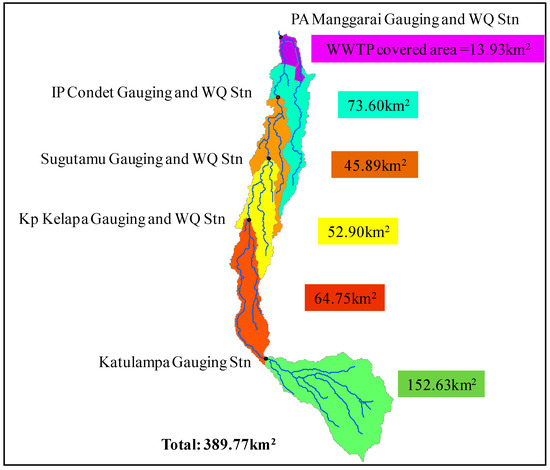 The entire problem domain and its different components are divided into five catchments, which are further subdivided into thirteen sub-basins considering influent locations of major tributaries (Figure 4). Other major considerations are the fourteen demand sites and one wastewater treatment plant to represent the problem domain. Here, demand sites are meant to identify domestic (population) and industrial centers defined with their attributes explaining water consumption and wastewater pollution loads per capita, water supply source, and wastewater return flow. Dynamic attributes are described as functions of time and include population and industries. Wastewater treatment plants (WWTPs) are pollution-handling facilities with design specifications that include total capacity and removal rates of pollutants. The flow of wastewater into the Ciliwung River and its tributaries mainly feeds through domestic, industrial and stormwater runoff routes. Here, an upflow anaerobic sludge blanket reactor (USAB) type of wastewater treatment plant is considered in the modeling and its pollutant treatment capacity is assumed accordingly. No precise data are available regarding the total volume of wastewater production from different sources. In the absence of detailed information, the daily volume of domestic wastewater generation is based on an estimated 130 L of average daily consumption per capita [1].