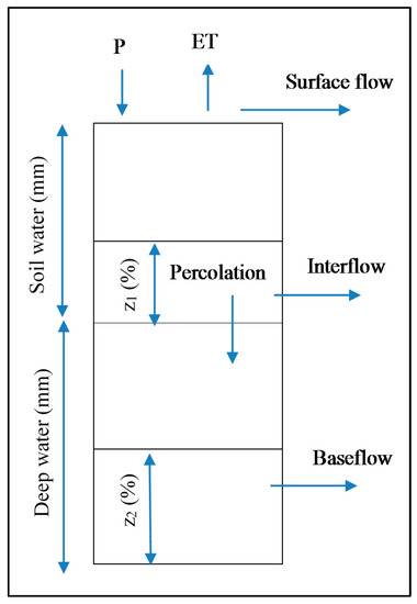 Under the WEAP hydrology module, the soil moisture method (which is the most sophisticated and widely accepted method) is used to estimate the different hydrological parameters for this study (Figure 3). This method can simulate different components of the hydrologic cycle, including evapotranspiration (ET), surface runoff, interflow, base flow, and deep percolation [19]. Empirical equations are employed to describe the rainfall-runoff and pollutant transport processes. With the soil moisture method, each catchment is split into two soil layers: an upper soil layer and a lower soil layer, which represent shallow water and deep water capacities, respectively. The upper soil layer accounts for spatial variation in different kinds of land use and soil types. The lower soil layer is meant to represent groundwater recharge and baseflow processes, and its parameters remain the same for the entire catchment. Different hydrological components are estimated, with z1 and z2 as the initial relative storage (%) for the upper (root zone) and lower (deep) water capacity, respectively (Equations (1)–(5)).