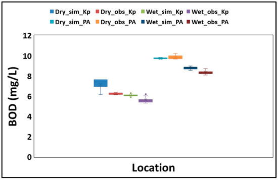 Additionally, the simulation performance of the water quality module was evaluated by comparing the BOD value for both the dry and wet seasons at two different locations, namely, Kp Kelapa and PA Mangarrai, as shown by box plot (Figure 8). The selection of these two stations and BOD as indicator was made on the basis of the consistent availability of observed water quality data for the year 2004.