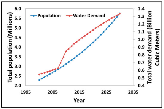 A simulation was conducted for water demand based on projected population growth for the year 2030 to get an overall impression about water scarcity. The result for total water demand is shown in Figure 9 and indicates that the annual water demand for the year 2030 will be approximately 1.34 billion m3, which is approximately 2.5 times that for 2000, i.e., 0.55 billion m3. This rapid rate of increase in demand should encourage water planners to take appropriate action in due course of time for sustainable management for future generations.