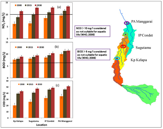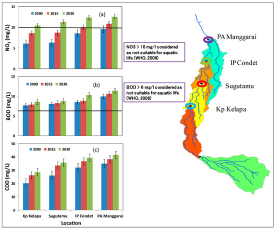 In the next phase, future simulation of water quality using selected parameters (NO3, BOD and COD) was conducted under two different scenarios, first, with population growth and planned expansion of current wastewater management infrastructure by 2030, and second, considering the effect of climate change along with population growth and wastewater management infrastructure. The idea behind running these two scenarios is to obtain a deep insight for possible policy intervention and provide a potential solution for water-related problems. Spatio-temporal simulation and prediction of water quality parameters was conducted for 2015 and 2030 using 2000 as a reference or base year. The simulation results for the water quality parameters using these two scenarios are shown in Figure 10 and Figure 11, respectively. Here, vertical black lines represent standard deviation in the data set which is statistically significant. Based on the water quality parameters, the general trend showed that water quality deteriorates from upstream to downstream because of the addition of an anthropogenic output (sewerage). Additionally, the magnitude of deterioration is of higher order in the case of the second scenario where climate change has an additional effect. The reason for this may be the high frequency of extreme weather events due to climate change in the second scenario. Here extended dry period because of climate change (low flow period in the rivers), might be one of drivers for increasing the concentration of contaminants. Explaining water quality more precisely, a high concentration of nitrate indicates the influence of agricultural activities, fertilizer use, microbial mineralization, untreated sewerage input, and animal waste. In general, most of the water samples are safe for the aquatic system in terms of NO3, except for at the PA Mangarrai location. However, with regard to the development with the climate change scenario, water quality will deteriorate at the other locations as well. The value for BOD varies from 7.65 to 11.35 mg/L, which clearly indicates that all the water samples are moderately to extremely polluted with reference to the BOD required value for a safe aquatic system, i.e., 6 mg/L [35]. The COD value, a commonly used indicator of both organic and inorganic nutrients in water samples, increases when extended into the future. The above result suggests that current management policies and near future water resources management plan are not enough to maintain the pollution level within the desirable limit and calls for transdisciplinary research in more holistic way for doing it sustainably.