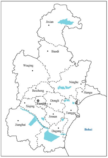 Tianjin (38°34′–40°15′ N, 116°43′–118°04′ E) is located in the northeast of China, the west of Bohai Sea (Figure 1). Tianjin covers 11,916.85 km2, where 6982.29 km2 is for agricultural production. In 2015, it had a population of 15.47 million and GDP of RMB 1.65 × 103 billion [24]. The total water consumption was 2.68 billion m3, including agricultural sector water consumption 1.23 billion m3, industrial sector water consumption 0.53 billion m3, municipal sector water consumption 0.51 billion m3, and environmental and ecological sector consumption 0.40 billion m3. The comprehensive water use per capita was about 173 m3, and the water consumption per million industrial added value was 765 m3 [25].