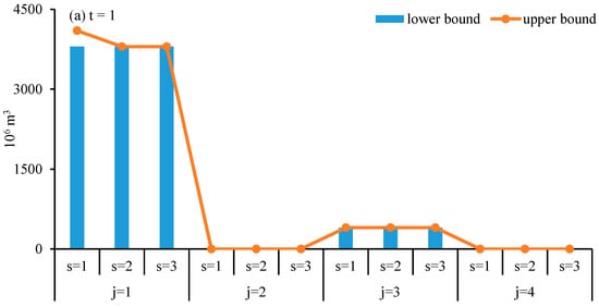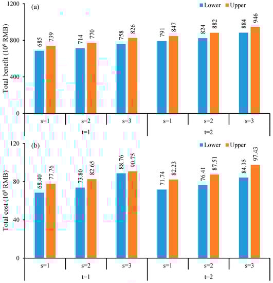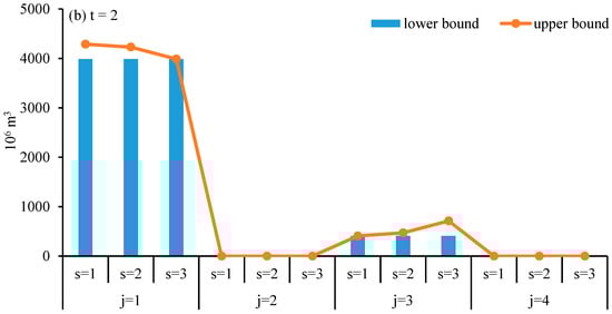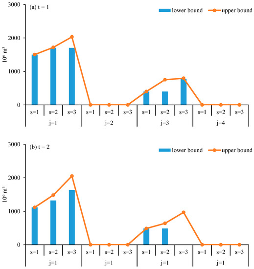 Figure 4 illustrates the total benefit and total cost under different scenarios during the planning periods. With the water demand increasing, both total benefit and cost would increase accordingly. The total benefit and cost in Period 2 would be much higher than that in Period 1. For example, under medium demand level scenario, during Period 1, the total benefit and cost would be RMB [714, 770] × 106 and RMB [73.80, 82.65] × 106; during Period 2, it would be RMB [824, 882] × 106 and RMB [76.41, 87.51] × 106, respectively. Besides, during the same period, under higher demand scenario, the total benefit and cost would also increase. For example, during Period 1, under low, medium, and high water demand levels, the total benefit would be RMB [685, 739] × 106, RMB [714, 770] × 106, and RMB [758, 826] × 106. Similarly, the total cost would be RMB [68.40, 77.76] × 106, RMB [73.80, 82.65] × 106, and RMB [88.76, 90.75] × 106, respectively.