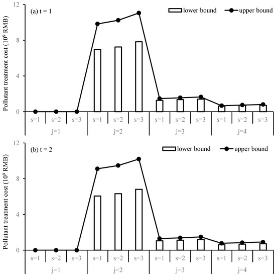Figure 5 illustrates the pollutant treatment cost for different sectors under various demand levels in the planning periods. The pollutant treatment cost would be affected by the pollutant treatment amount and price in the future. Since the water utilization in agricultural sector would not be recycled, no pollutant treatment cost in agricultural sector would occur. Due to the high pollutant treatment price for industrial sector, the total pollutant treatment cost in industrial sector would be much higher, followed by municipal, and environmental and ecological sectors. For example, during Period 1, under medium demand level, the pollutant treatment cost for industrial, municipal, and environmental and ecological sectors would be RMB [7.25, 1024] × 109, RMB [1.32, 1.56] × 109, and RMB [0.70, 0.74] × 109, respectively. During the same planning period, under higher demand level, the pollutant treatment cost would be greater. For example, during Period 1, under low, medium, and high demand level, the pollutant treatment cost would be RMB [1.27, 1.47] × 109, RMB [1.35, 1.56] × 109, and RMB [1.40, 1.65] × 109. However, with relevant technology development in the future, the pollutant treatment price would expected to be lower, which would reduce the total pollutant treatment cost in some degree.