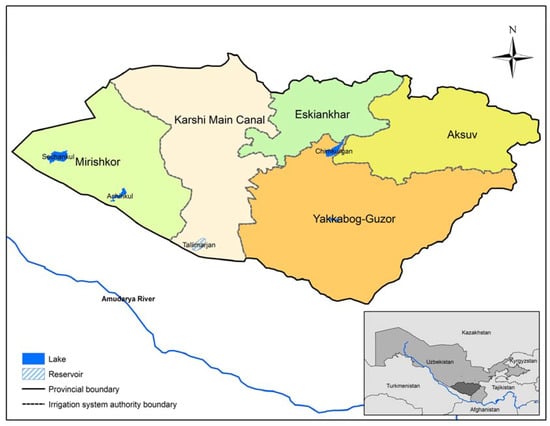 Kashkadarya has an ethnically diverse population (including Uzbeks, Tajiks, Turkmens, Russians, and Tatars). The temperature ranges from −2 °C in winter to above 30 °C in summer [35,36]. The province experiences frequent water shortages. The average annual precipitation is about 245 mm and the average annual potential evapotranspiration is above 1240 mm, resulting in a substantial annual deficit [35]. Thus, large-scale irrigation is essential.