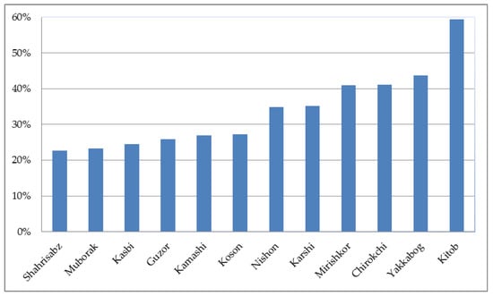 Of the 152 WCAs in Kashkadarya Province, eight were chosen for closer study. The selection was not a trivial task. Social scientists have suggested different strategies for choosing study cases that have the greatest potential to improve understanding [42,43]—in this study, to test the hypotheses about the effectiveness of common-pool resources management.