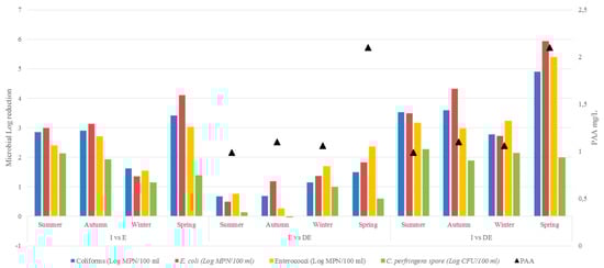 The analysis of variance (ANOVA) showed statistically significant differences between the averages of the four indicators in the different sampling points (p < 0.05), in particular between the influent and the effluent and between the influent and the disinfected effluent, as highlighted by the post hoc Tukey test (Table 5). No statistically significant differences were observed between the concentrations of the indicators in effluents before and after PAA treatment, probably due to the increased reduction of the bacterial load in the spring sample, when the PAA dose was doubled and to the high bacterial abatement in the pretreatment effluent. Therefore, additional sampling could be useful for confirming the obtained data regarding the higher dose of PAA tested.
