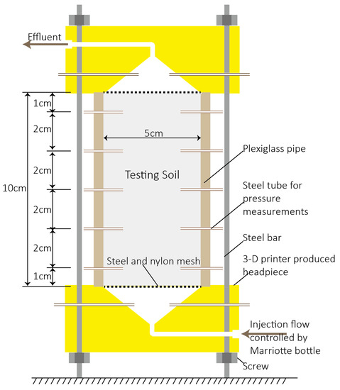The apparatus used for this column test is shown in Figure 1. A five cm inner diameter plexiglass pipe was cut into pieces of 10 cm in length, and small holes were drilled through the pipe wall at various distances from the bottom end, i.e., 1 cm, 3 cm, 5 cm, 7 cm, and 9 cm. Three holes, two of which are shown in Figure 1 were drilled at each distance, and uniformly distributed at every 120° around the pipe wall. Slim steel tubes with the same external diameter (1/16 inches) to that of the holes were inserted into the pipe. It should be noted that the in-column ends of steel tubes were all covered with nylon mesh to prevent particle clogging. Headpieces of the apparatus were produced by 3-D printing (uPrint SEPlus, Stratasys Inc., Eden Prairie, MN, USA), using the designation proposed by Rangel et al. (2012) [36]. The funnel-shaped grooves were expected to generate a unidirectional flow in the column, and aqueous solutions were either injected or collected from the reserved pipe. Additionally, two small holes were reserved in the headpieces, and steel tubes were inserted into the grooves. The headpieces were painted for impermeability and then tightly connected with the prepared plexiglass pipe. Rubber rings were placed at the interfaces to prevent leakage and the entire connection was reinforced by steel bars and screws. Finally, all slim steel tubes were connected to hoses for pressure head measurement, and the pressure heads measured at the same distance from the bottom were averaged.