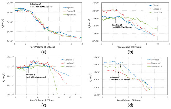 The testing soils were layer-compacted into the plexiglass pipe, with steel and nylon mesh placed at the bottom and top, to support the soils and to prevent particle loss. These compactions were carried out in triplicate for each soil type. Bulk densities of the compacted soils were 1.48 g·cm−3, 1.50 g·cm−3, 1.38 g·cm−3 and 1.36 g·cm−3 for Sparta, Gilford, Lewiston and Greenson, respectively, and differences among the triplicates were controlled less than 0.005 g·cm−3. Aqueous solutions were injected from the bottom of the column, with the pressure head controlled by a Marriotte bottle. The soils column was pre-saturated with a 1 mM KCl solution, by elevating the Marriotte bottle controlled pressure head at a rate of approximately 1 cm·h−1. The pressure head of the injection flow was then controlled to be constant, and the 1 mM KCl solution was continuously injected to achieve an approximate 1.2–2.5 pore volume (Vp, one Vp was about 82 cm3, 80 cm3, 89 cm3 and 91 cm3 in Sparta, Gilford, Lewiston and Greenson columns, respectively). A 1 mM KCl + 2CMC Aerosol solution was then injected. The flow rates of the effluent were continuously monitored during the test, as were the pressure heads throughout the columns. The pressure head at the inlet was approximately 30 cm higher than at the outlet, and the accuracy of the pressure head measurements was ±0.5 mm, and that of the effluent volume was ±0.5 mL. After a period of test, water leakage was observed at the junction between the plexiglass pipe and the lower headpiece, and the corresponding triplicate tests were all stopped when this occurred. Eventually, durations of Sparts, Gilford, Lewiston and Greeson columns tests were 34 h, 72 h, 74 h, and 342 h, respectively.