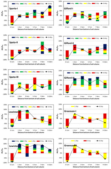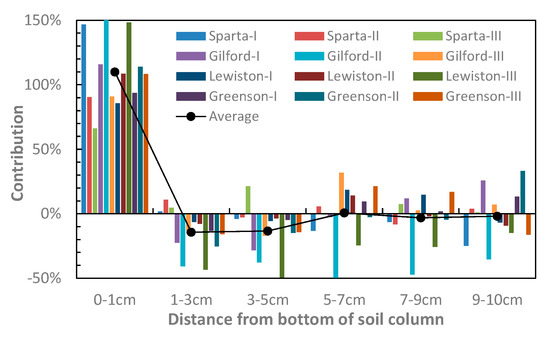 The contribution of each soil layer in the variations of the overall Ks of columns after an injection of a 4-Vp surfactant solution for Sparta, Gilford, and Lewiston, and a 2-Vp injection solution for Greenson. Since the Ks of all columns declined during surfactant solution injections (Figure 2), positive contribution means Ks decline of a soil layer, while the negative contribution means an increase in Ks.