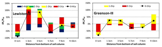 The collapse of soil aggregates and particle dispersion are inevitable in the presence of anionic surfactant. Regarding individual soil particles, the presumably laminar flow in the soil pores was not able to flush them upwards into effluents; instead, small clayey particles were likely to percolate downward by gravity, while leaving behind the coarse particles. Consequently, a densely structured layer would then form at the bottom while the porosity of the above layers would in turn increase. Such an increase could, at least partially, explain the dramatic Ks reduction of the 0–1 cm layer, and the general Ks increase of the 1–3 cm and 3–5 cm layers (Figure 4). Specifically, after 4-Vp (2-Vp for Greenson) surfactant injection, the relative Ks increases of the 1–5 cm layer were −12.4%, 29.8%, 82.3%, and 39.5% for Sparta, Gilford, Lewiston, and Greenson, respectively, by replicate averages. These values show an increasing trend with higher clay contents, which is in accordance with the results of the experiments conducted by Gardner and Arias (2000) [37].