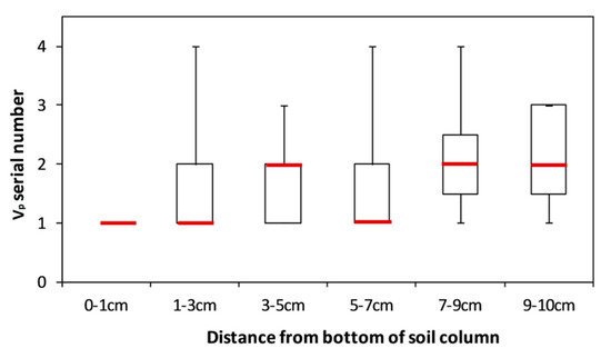 Pore volume serial number of surfactant solution during which Ks exhibited the most changes. Red bars represent the median values. The data of the Greeson columns was not included, since only a 2-Vp surfactant solution was injected. In the Greenson columns, the Ks of the 0–1 cm and 1–3 cm were more likely to change most in the first Vp of the surfactant solution, while the Ks in the 3–5 cm, 5–7 cm, 7–9 cm, and 9–10 cm were more likely to occur in the second Vp of surfactant solution (see Figure 4).