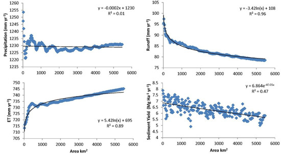 Figure 1 illustrates the relationships between several key SWAT predictions and the level of aggregation present in the precipitation used. Variability in average annual precipitation was inversely correlated with the aggregation area, but there was no systematic trend in mean values. Both runoff and sediment yield were reduced with increasing aggregation area while evapotranspiration increased. This analysis indicates that sediment and runoff may be reduced by 20% when using spatially aggregated data, and that even at low levels of aggregation, model predictions may be significantly affected. Other researchers have also noted that model performance when using NEXRAD data decreased with increasing watershed size [