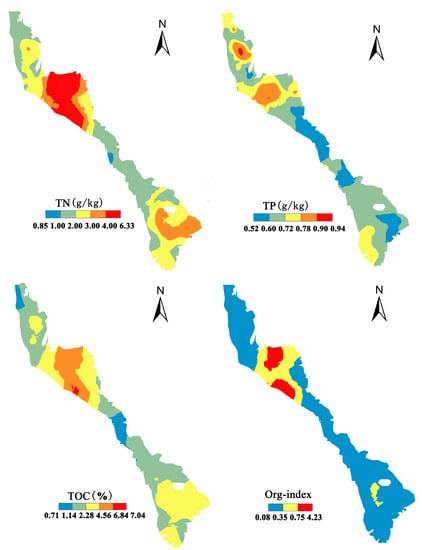 The semi-variogram models and their best-fitted parameters were given in Table 2 and Figure 2. A spherical model was applied to fit the spatial structure of most indexes in sediments except TP (with an exponential model). The nugget-to-sill ratio, as a rough guideline, was widely applied to define distinctive features of spatial dependence for the variables [39,40,41]. The value of the nugget-to-sill ratio for TP, TN, TOC and Org-index were 0.45, 0.31, 0.51 and 0.56, respectively. The variable is considered to have a strong spatial dependence if the value of the “nugget-to-sill” ratio is less than 0.25, a moderate spatial dependence if the value is between 0.25 and 0.75, and a weak spatial dependence if the value is greater than 0.75. Variables that are strongly spatially dependent are controlled by intrinsic factors such as soil texture, while weak spatial dependence may be controlled by extrinsic factors such as human activities in agriculture, industry and aquaculture [42]. The semi-variograms obtained in this study implied the existence of weak spatial dependence for all the indexes, indicating that both intrinsic and extrinsic factors could influence the spatial dependence of nutrients in the surface sediments of Nansi Lake. This was also confirmed by the previous studies [4,5,7,9,43].