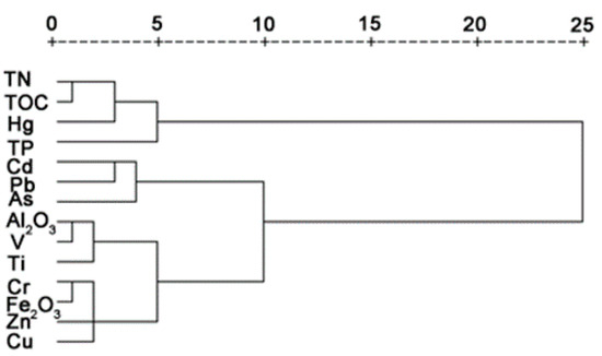 According to cluster analysis, the contents of elements in sediments were Z-score standardized, and the Euclidean distance for similarities among variables was calculated. Then hierarchical clustering was performed on standardized data applying between-groups linkage (Figure 4). The results showed four statistically significant clusters: (1) TOC-TN-Hg, (2) Cd-Pb-As, (3) TP and (4) Al2O3-V-Ti-Cr-Fe2O3-Zn-Cu.