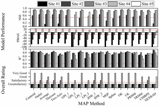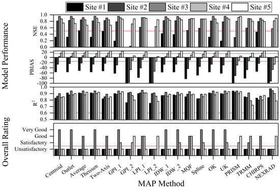 Mean areal precipitation (MAP) input effects on uncalibrated hydrological model performance criteria and overall performance ratings for SWAT model simulated annual streamflow at five gauging sites (gray-scale columns) located in the Hinkson Creek Watershed, Missouri, USA. The red lines show “Satisfactory” model performance thresholds. PBIAS values smaller than −100 are not shown.