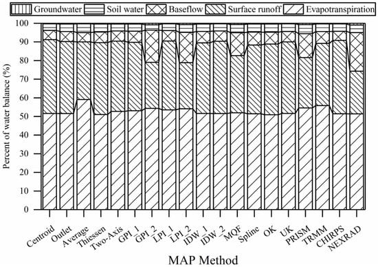 Mean areal precipitation (MAP) input effects on water balance variables after SWAT model calibration in the Hinkson Creek Watershed, Missouri, USA. SWAT models were forced with 19 different precipitation methods. All results are shown in depth of water (mm). The percent of total water input is shown parenthetically. Precip. is precipitation, ET is evapotranspiration, and Ground water is deep aquifer recharge.
