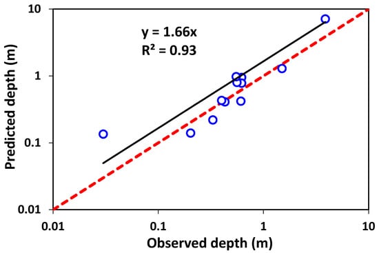 Comparison of the predicted soil depth via Equation (2) versus the observed depths for 12 sites (open circuits) from all around the world. The dashed red line represents the 1:1 line. See Table 1 for further details.