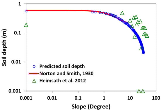 Predicted and observed soil depth as a function of slope. The Norton and Smith data were digitized from Jenny [10], but extend only to a slope of 8 degrees. The Heimsath et al. [45] data were reported in a Table and extend over the range of 6 degrees to 32 degrees. The erosion function input was digitized from Figure 1 of Montgomery and Brandon [60]. I was given in Table 1 here, and a typical particle size of 30 μm, close to the 20 μm value considered to be most likely to characterize the San Gabriel mountain slopes, was applied. In order to reduce the scatter in the reported data, we give the mean soil depth at any particular slope value, although this will attach additional weight to the locations with deeper soils.
