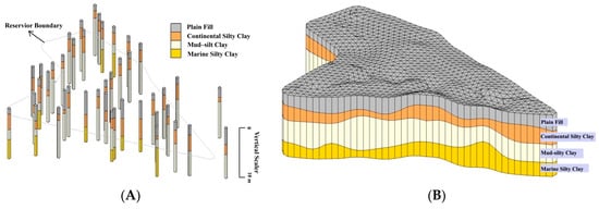 Spatial distribution of boreholes (A), and the 3D geological structure (B).