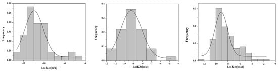 It is noted that the sample size of the first layer was only 18, and the lithology of the first layer was not silty clay, but plain fill. Therefore, the statistical analysis of the first layer was excluded in the following text. The frequency histograms for the hydraulic conductivity of each layer were plotted (Figure 2). The normal distribution was easily rejected by the low hydraulic conductivity values, such as NCG datasets. Therefore, the horizontal axes are in the natural logarithm scale. The frequency bars were nearly symmetrically distributed, as inspected from Figure 2, indicating these K datasets were graphically confirmed to be logarithmic normal distributions.