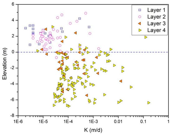 All the hydraulic conductivities obtained from the four layers’ sediments versus the elevations were plotted (Figure 3). An apparently decreasing trend and a horizontal divide (elevation of 0 m a.s.l) is shown by this scatter plot. The shallow sediments for layers 1 and 2 had a relatively small range of K compared to the deep sediments for layers 3 and 4. This overall decreasing trend of K was controlled by the stratigraphic lithology. The marine sediments were general coarser than the continental sediments and plain fill, shown from the larger values and the greater range of K.