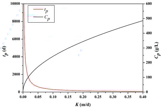 The studied case was an assumed 1-D cylinder filled with a homogenous isotropic porous medium, of infinite length. The conservative solute weighing 10 kg was injected to the cylinder. The cylinder cross-section was square at 10 cm × 10 cm. The effective porosity (ne) was 0.3, and the longitudinal dispersion coefficient (DL) was 0.05 m2/d. Although the porosity and dispersion coefficients were indeed of high variations for subsurface mediums, even for the silt and clay materials, we only focused the influence on the solute transport from the variation of K rather than the porosity and dispersion coefficients. The hydraulic gradient was set to a constant of 1.0, and the velocity (u) become a single-valued function of K; then the explicit expressions of tp-K and Cp-K could be easily obtained from Equations (5) and (6). The monotonic variations, both of increasing Cp and decreasing tp, with the increasing K value were observed from Figure 4. High tp and low Cp values were consistent with the small K, and low tp and high Cp values corresponded to a strong permeability of high K.