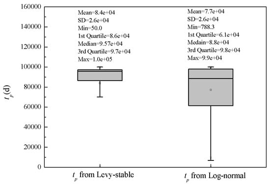 As shown in Figure 5, the range of peak times simulated by the Levy stable distribution (50.0 d, 1.0 × 105 d) was a little greater than that simulated by the log-normal distribution (788.3 d, 9.9 × 104 d). The minimum values especially between these two distributions were significantly different. This indicated that the Levy stable distribution could generate greater random values of K and then result in a smaller peak time. Additionally, the mean and median values of simulated peak time values from the Levy stable distribution (8.4 × 104 d and 9.6 × 104 d) were apparently greater than those of the log-normal distribution (7.7 × 104 d and 8.8 × 104 d). The interquartile ranges (IQRs) for the Levy-stable and log-normal distributions were 1.1 × 104 d and 3.7 ×104 d, respectively. From Figure 5, the simulation results of peak times from the Levy stable distribution are gathered in the area of greater value, and random numbers of K generated by the Levy stable distribution concentrate in the area of lower value. These results agreed with the high-peak and heavy-tail characteristics of the Levy stable distribution.