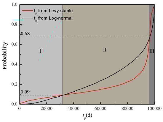 The peak time of Section II was between 3.3 × 104 d and 9.6 × 104 d, and Section II is shown as the middle part of Figure 5. According to the correlation between the peak time and K mentioned above, this section corresponds to the range for which K was moderate (greater than that in Section I and less than that in Section III). The simulation results indicated that the log-normal distribution achieved a higher probability than the Levy stable distribution. The probability of random events with moderate peak times simulated by the Levy stable distribution was less than that for the log-normal distribution. The peak time of Section III was the highest, representing the smallest K. The simulation results indicated that the probability of high peak time events simulated by the Levy stable distribution was larger than for the log-normal distribution.