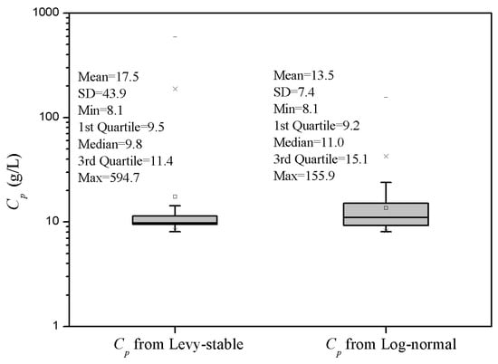 As shown in Figure 7, the range of peak concentrations (Cp) simulated by the Levy stable distribution (8.1 g/L, 594.7 g/L) was significantly greater than that simulated by the log-normal distribution (8.1 g/L, 155.9 g/L). The maximum values between these two distributions were significantly different. The average value of the simulated peak concentration from the Levy stable distribution (17.5 g/L) was slightly greater than that from the log-normal distribution (13.5 g/L). However, the median of the Levy stable distribution (9.8 g/L) was slightly less than the counterpart of the log-normal distribution (11.0 g/L). Although the standard deviation of Cp from the Levy stable distribution (43.9 g/L) was much greater than that from the log-normal distribution (7.4 g/L), the Levy stable distribution could generate a concentrated Cp (IQR = 1.9 g/L) compared with the log-normal distribution (IQR = 5.9 g/L), as seen from the shorter box in Figure 7.