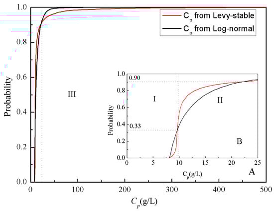 Cumulative frequency distribution of Cp from Levy stable and log-normal distribution K values (8A shows the full extent and 8B shows the part of Cp less than 25 g/L).