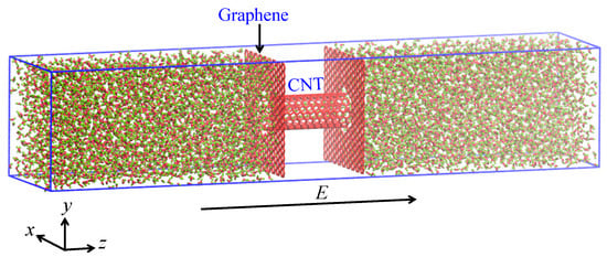 The configuration of the molecular dynamics (MD) simulation consists of an carbon nanotube (CNT), two graphene sheets, and water reservoirs on both sides. Water molecules fill the reservoirs, and an electric field E is applied in the z direction.