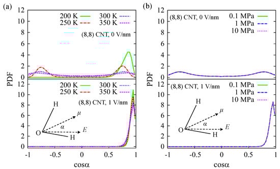 Orientation of water molecules in an CNT: (a) at various temperatures from 200 K to 350 K and ambient pressure of 0.1 MPa. The applied electric field strengths are 0 V/nm (top) and 1 V/nm (bottom). The orientation is indicated by the angle , which is the angle between the dipole moment and the electric field E. O and H represent oxygen and hydrogen atoms, respectively. The vertical axis shows the probability distribution function (PDF); (b) at various pressures from 0.1 MPa to 10 MPa, 300 K, and 0 V/nm (top) and 1 V/nm (bottom).