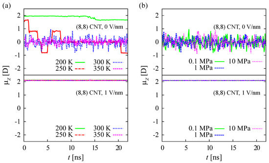 Average dipole moment of water molecules in a CNT in the axial direction (): (a) at various temperatures from 200 K to 350 K, 0.1 MPa, and 0 V/nm (top) and 1 V/nm (bottom); (b) at 0.1 MPa to 10 MPa, 300 K, and 0 V/nm (top) and 1 V/nm (bottom).