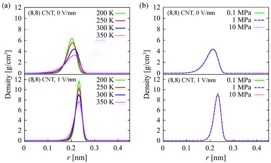 The densities of oxygen atoms in an CNT in the radial direction at various temperatures and pressures are shown in Figure 4a,b, respectively. At E = 1 V/nm, the density distribution is narrower and the peak is higher, compared with at E = 0 V/nm. This is observed for both various temperatures (Figure 4a) and pressures (Figure 4b). This implies that the water structure in an (8, 8) CNT under an electric field differs from that in the absence of an electric field at all simulated temperature and pressure conditions. This is discussed in more detail in the next paragraph. At lower temperatures, the distribution is narrower and consequently the peak is higher, especially at 0 V/nm (Figure 4a). This indicates that, at E = 0 V/nm, the water structure changes with increasing temperature. The change in pressure does not change the radial density distribution, either in the presence or absence of an electric field, as shown in Figure 4b. This suggests that increasing the pressure up to 10 MPa does not change the water structure. A similar result is observed using the TIP4P model (Figure S3). However, the distribution with the TIP4P model is slightly narrower than that with the SPC model at 300 K and 0 V/nm. It is consistent with the result of polarization in the previous paragraph. Another difference is that the distribution with the TIP4P model is slightly wider than that with the SPC model at 350 K and 1 V/nm. This suggests that, at 350 K and 1 V/nm, both water models have different structures.