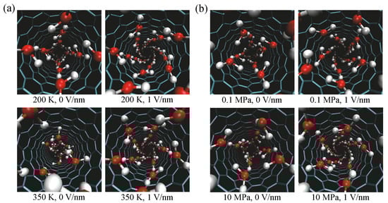 Structures of water molecules in an CNT: (a) at K and 350 K, MPa, and V/nm and 1 V/nm; (b) at MPa and 10 MPa, K, and V/nm and 1 V/nm. Under an applied electric field, the structure of water in the CNT is the same at all simulated temperatures and pressures. The structure differs from that in the absence of an electric field.