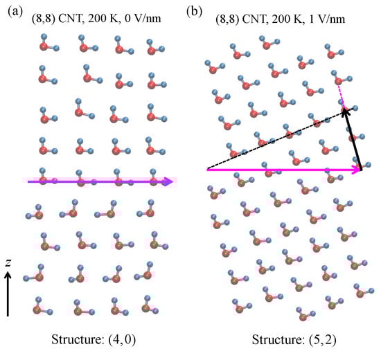 Snapshots of water structures in an (8, 8) CNT at temperatures of 200 K and 350 K and at pressures of 0.1 MPa and 10 MPa are shown in Figure 5a,b, respectively. Snapshots under applied electric fields of 0 V/nm and 1 V/nm are shown in both cases. The structure of water molecules is helical under an applied electric field of 1 V/nm. Under the applied electric field, the structure is the same at all temperature and pressure conditions. This result differs to that in the absence of an electric field. To better understand the water structure, we unrolled the water structure to obtain a two-dimensional (2D) structure. The radial positions of oxygen atoms in the CNT are averaged to determine the radius of the tube. The unrolled 2D structures are shown in Figure 6a for 200 K, 0.1 MPa, and 0 V/nm, and in Figure 6b for 200 K, 0.1 MPa, and 1 V/nm. The structure is identified using the index [50,51], as was used in our previous study [35]. If m, the structure is helical. If m = 0, it is an n-gonal structure [10,50,51]. As an example, water molecules in the structure of Figure 6b form an orderly arrangement, i.e., in both the column (magenta-dotted line) and row (black-dotted line) directions. The width of the structure is five column units (magenta arrow), and the number of rows corresponding to the five unit width is two units (i.e., the length of black arrow). Thus, it is a helical structure. In the same manner, the structure shown in Figure 6a is a 4-gonal structure. The difference in the two ordered structures, and , suggests that an electric field induces a phase transition from solid to solid. The snapshot in Figure 6a also supports our above conclusion that at 200 K and 0 V/nm, the water exhibits ferroelectric behavior. The directions of the dipole moments of all water molecules are on the positive z-axis.
